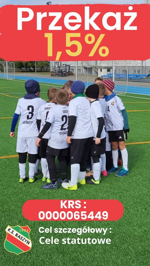 Twój 1,5% może realnie wesprzeć rozwój dzieci i młodzieży w naszej Akademii. To dzięki takim środkom możemy szkolić, rozwijać pasję do sportu i tworzyć dobre warunki do treningu dla młodych zawodników KS Raszyn.